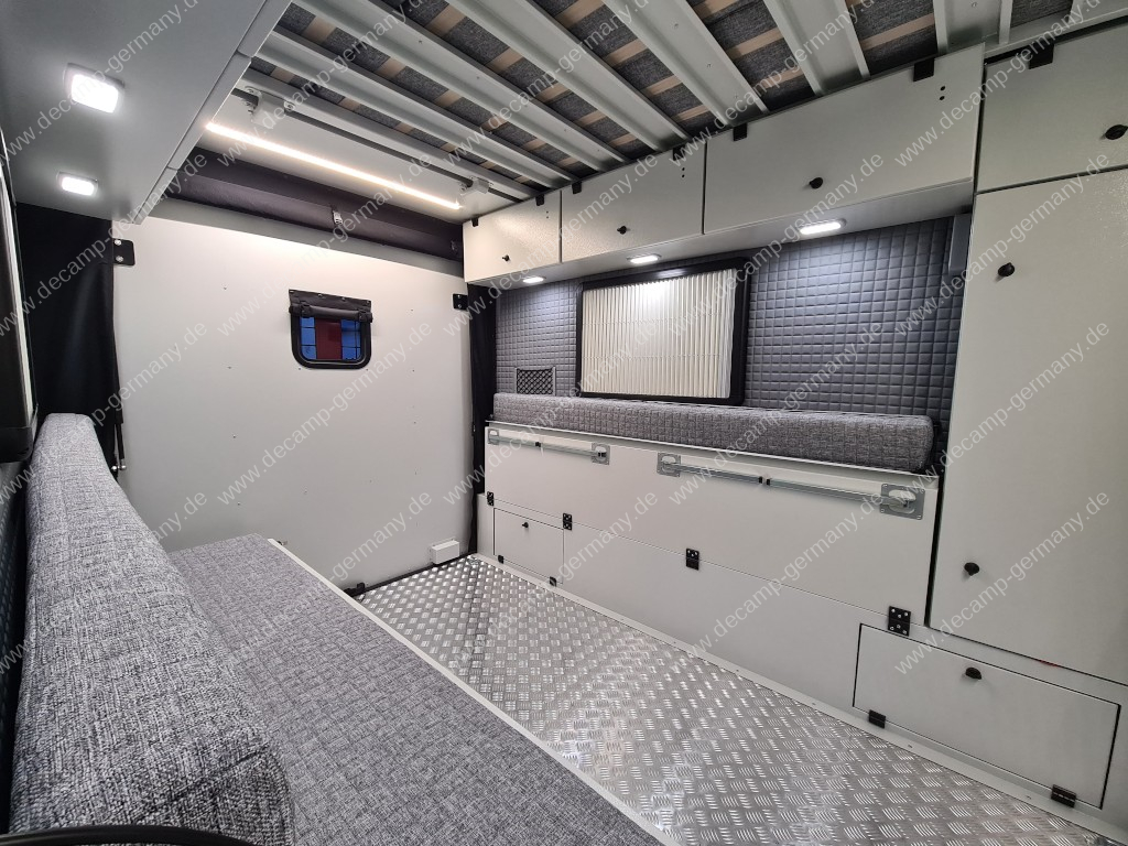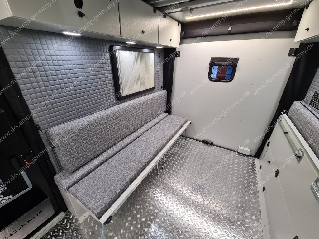 - Sitzbänke einklappbar und zum Bett umbaubar mit einer Liegefläche von 184 x 187 cm