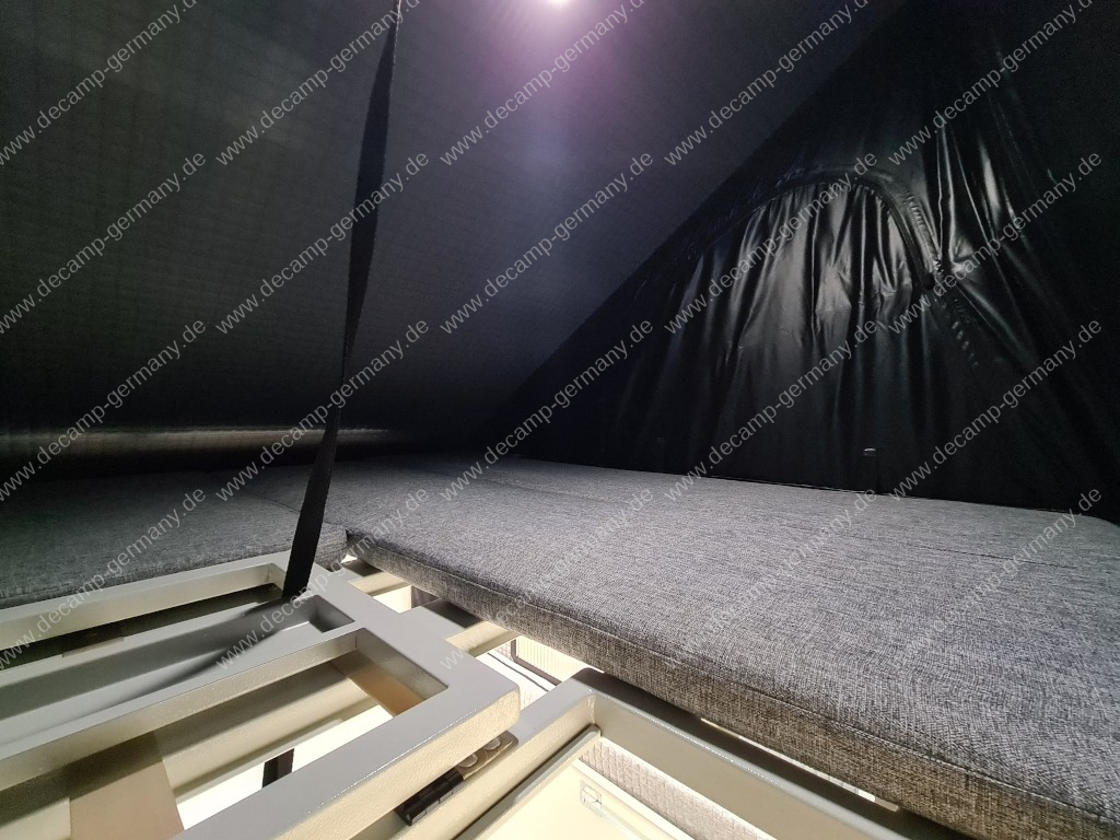 - 2-Personen Bett im Aufstelldach mit einer Liegefläche von 200 x 150 cm (optional)